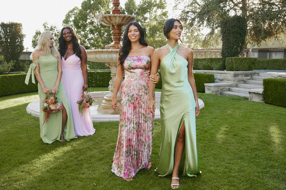 Pleated bridesmaid dresses feature carefully designed folds in the fabric that add movement, texture, and dimension to the silhouette. Pleating helps dresses drape beautifully on a variety of body types while creating an elevated, timeless look that photographs well.