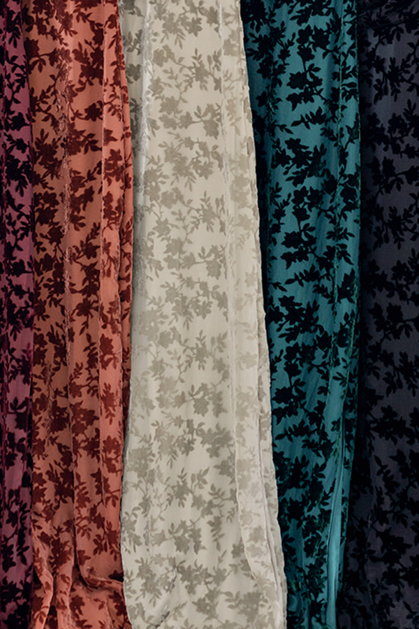 Low stretch, tactile and visually rich, the plush velvet floral pattern contrasts sheer mesh